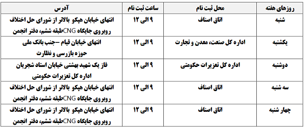 به اطلاع می رساند بر اساس اعلام فرمانداری شهرستان اراک، در خصوص از دسترس خارج شدن سامانه عضویت انجمن حمایت از حقوق مصرف کنندگان، ثبت نام متقاضیان عضویت با در دست داشتن کپی شناسنامه، کپی کارت ملی و یک قطعه عکس به صورت حضوری در مکان های  ذیل صورت می پذیرد.
