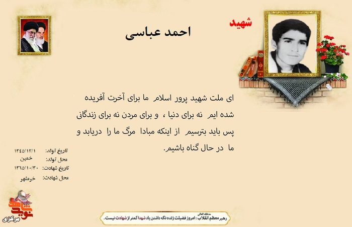 فرازی از وصیت نامه شهدا ۱۳ دی ۱۴۰۴ | ۱۰:۰۱ کد : ۵۷۴۶۹ اطلاعیه ارسال به دیگران نام شما ایمیل شما ایمیل دریافتکننده ارسال انصراف تعداد بازدید:۱۲۷ فرازی از وصیت نامه شهدا فرازی از وصیت نامه شهید بزرگوار احمد عباسی :