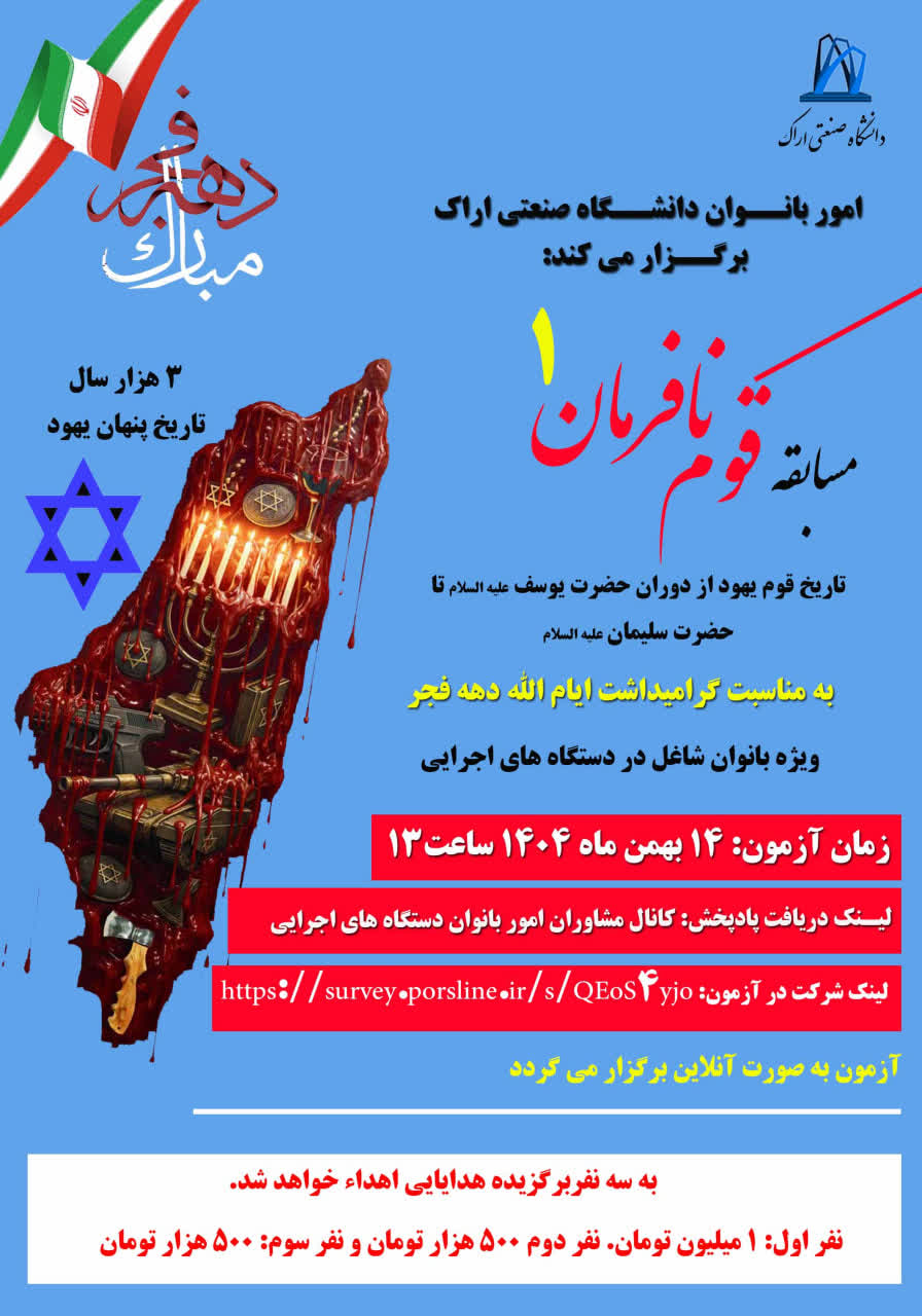 مسابقه قوم نافرمان ۰۸ بهمن ۱۴۰۴ | ۱۰:۳۹ کد : ۵۷۷۴۳ اطلاعیه ارسال به دیگران نام شما ایمیل شما ایمیل دریافتکننده ارسال انصراف تعداد بازدید:۱۱۱ برگزاری مسابقه قوم نافرمان، در ایام الله دهه فجر