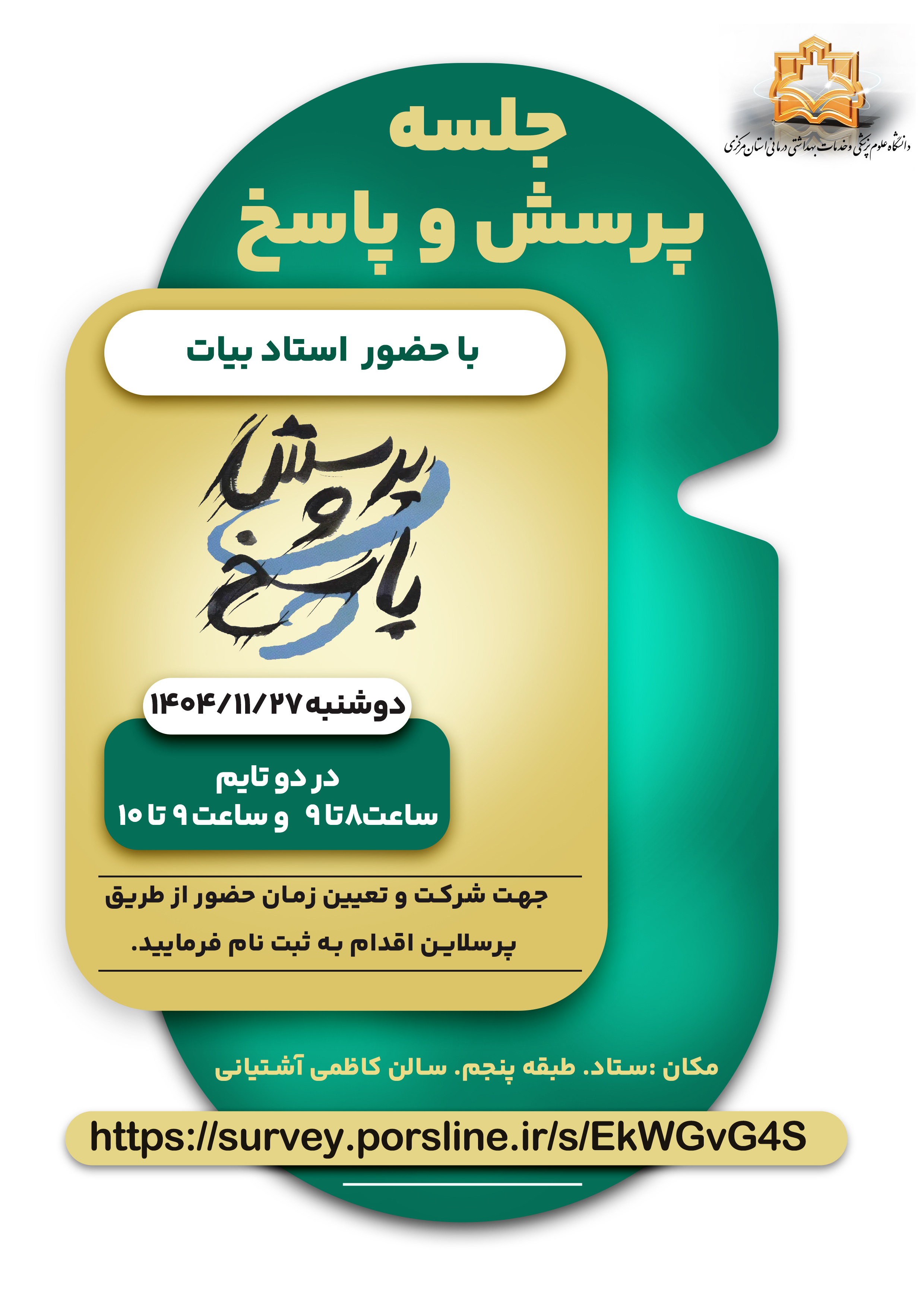 جلسه پرسش و پاسخ ۲۶ بهمن ۱۴۰۴ | ۱۱:۱۴ کد : ۵۸۰۰۷ اطلاعیه ارسال به دیگران نام شما ایمیل شما ایمیل دریافتکننده ارسال انصراف تعداد بازدید:۳۱۶ جلسه پرسش و پاسخ، با حضور استاد بیات برگزار می گردد.